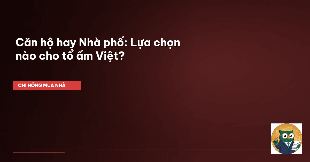 ⏱️ 13 phút đọc · 2545 từ Giới Thiệu: Đau Đầu Chọn Nhà Cho Tổ Ấm Chào cả nhà Cú Thông Thái thân mến! Lại là Chị Hồng BĐS đây. Mấy nay nhận được bao nhiêu câu hỏi của các mẹ bỉm, các anh chị trẻ xoay quanh một nỗi niềm chung: "Chị Hồng ơi, vợ chồng em lương vừa phải, gom góp được một ít, giờ nên mua căn hộ hay nhà phố để an cư lạc nghiệp đây?" Ôi, cái câu hỏi này đúng là ám ảnh biết bao gia đình Việt mình, đặc biệt là những ai đang lần đầu đi tìm tổ ấm. Không có câu trả lời nào là đúng hay sai hoà…