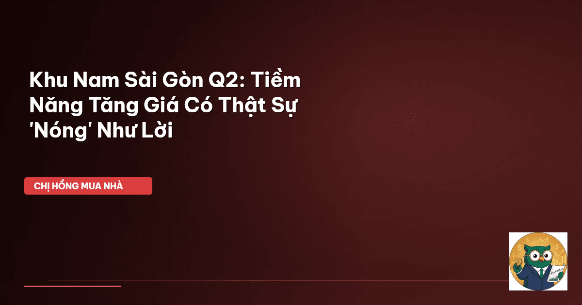⏱️ 12 phút đọc · 2258 từ Giới Thiệu: Mẹ Bỉm Ơi, Khu Nam Sài Gòn Đang 'Rục Rịch' Gì Đó! Chào cả nhà Cú Thông Thái! Lại là Chị Hồng BĐS đây. Dạo này các mẹ bỉm, các anh chị làm văn phòng cứ hỏi Chị Hồng mãi về khu Nam Sài Gòn. Nào là liệu Q2/2024 có phải là thời điểm vàng để 'xuống tiền' không, giá nhà có lên nữa không, rồi mua ở đâu cho hợp lý? Nghe các mẹ hỏi mà thương quá, ai cũng muốn có một căn nhà ấm cúng cho gia đình nhỏ của mình. Đúng là thị trường bất động sản khu Nam Sài Gòn, bao gồm Quậ…