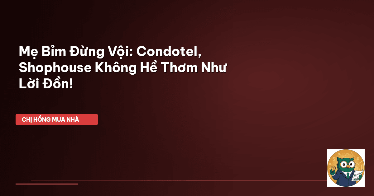 ⏱️ 11 phút đọc · 2105 từ Giới Thiệu: Miếng Bánh Thơm Condotel, Shophouse Có Đúng Như Lời Đồn? Chào các mẹ bỉm sữa, các ông bố bà mẹ đang ấp ủ giấc mơ làm giàu từ bất động sản! Dạo gần đây, Chị Hồng nghe không ít câu chuyện về condotel hay shophouse, ai cũng bảo đó là "gà đẻ trứng vàng" hay "của để dành" xịn xò. Thật tình, nhiều chị em còn bàn nhau "gom tiền đầu tư chung cho đỡ mệt". Nghe thì hấp dẫn lắm đúng không? Nhưng mà, đời đâu có "dễ ăn" như vậy. Đằng sau những lời quảng cáo đường mật đó, …