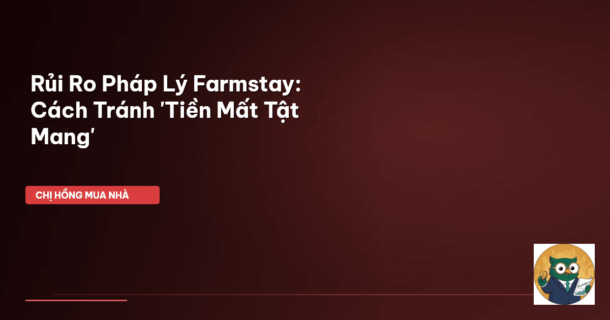 ⏱️ 13 phút đọc · 2553 từ Giới Thiệu: Đừng Để Giấc Mơ Farmstay Biến Thành Ác Mộng Pháp Lý! Mấy nay, chị em mình rỉ tai nhau chuyện làm farmstay rôm rả lắm đúng không? Ai cũng mơ có một mảnh đất xinh xinh ở ngoại ô hay vùng ven, vừa để gia đình nghỉ dưỡng cuối tuần, vừa cho thuê kiếm thêm chút "tiền bỉm sữa". Nghe thì hấp dẫn đấy, nhưng Chị Hồng BĐS phải nói thật là, đằng sau cái vẻ đẹp nên thơ của farmstay là cả một rừng rủi ro pháp lý mà nếu không cẩn thận, không chỉ mất "tiền bỉm sữa" mà còn có…